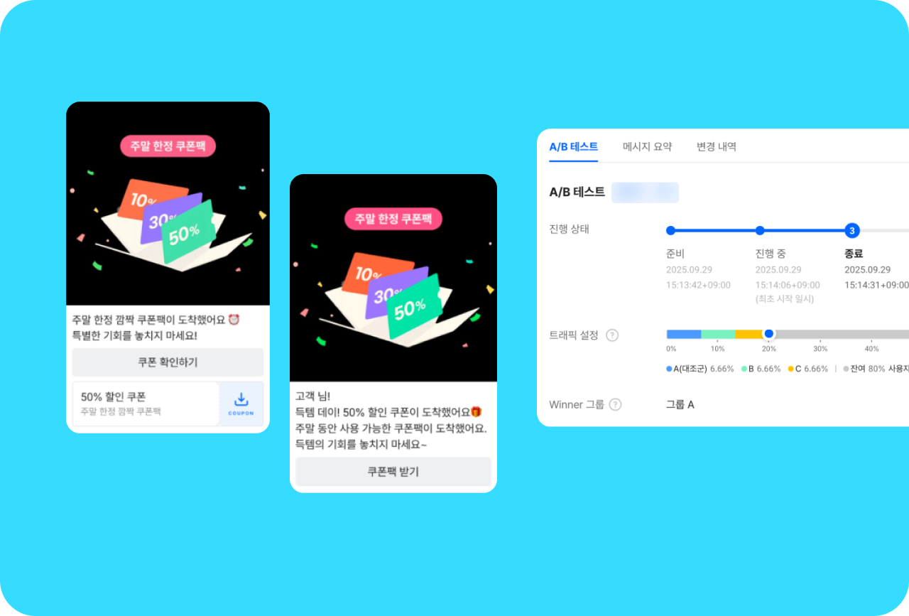 메시지의 문구, 버튼, 템플릿 레이아웃 등을 바꿔 실험하고 우리 고객이 더 잘 반응하는 방향을 데이터로 확인해보세요.