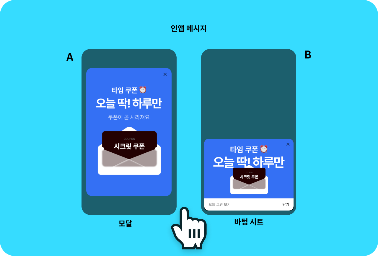 예를 들어 [오늘만 30% 할인!  vs  지금 구매하면 30% 할인! ] 이처럼 문구 하나만 달라져도 고객 반응은 달라질 수 있어요.모달⎢배너⎢바텀시트 등 레이아웃 형식에 따른 실험도 가능하고 신규 고객⎢멤버십 (VIP)⎢장바구니 이탈자 등 세그먼트별로 다른 메시지를 발송해 어떤 고객군이 어떤 메시지에 반응하는지도 확인할 수 있습니다.