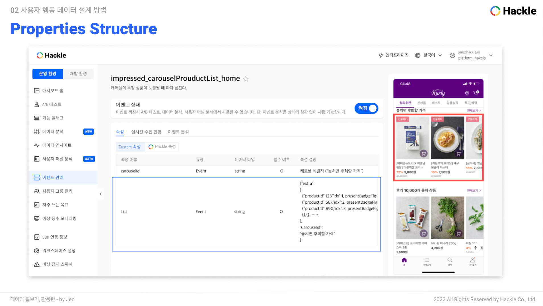 Jen님께서 추후 데이터 집계현황을 확인하거나 분석할 때를 고려해서 속성값을 남기는 팁을 공유해주셨는데요. 하나의 캐로셀 노출 이벤트에서 속성들을 각각 array 배열로 정의하는 것을 지양하는 것이 좋습니다. 대신, 하나의 속성에 “List”라는 이름으로 string 데이터 타입으로 정의하고, 실제 데이터는 Json형식으로 key, value형태로 저장하면 됩니다.