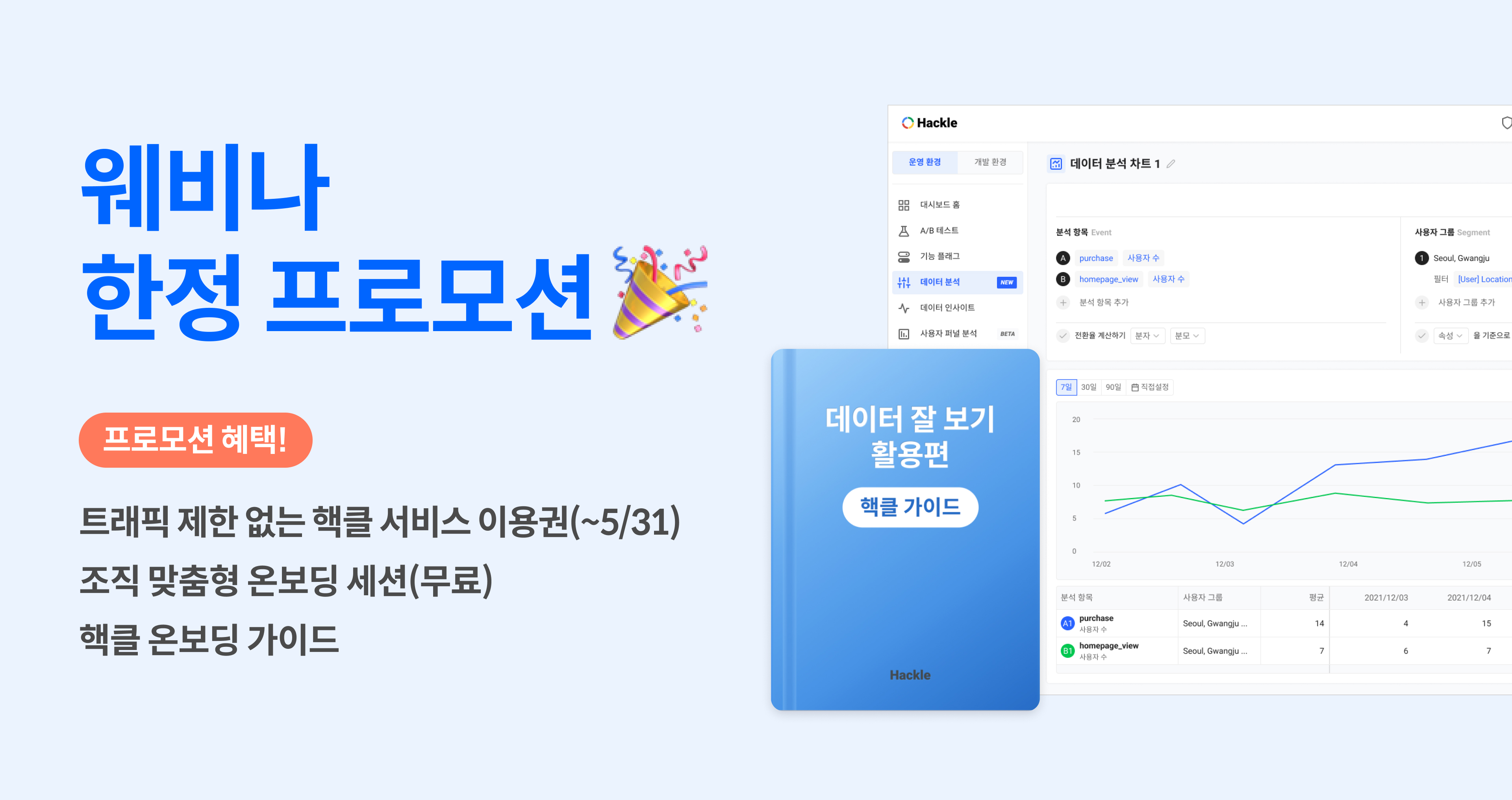 웨비나에서 다룬 퍼널 분석, 비즈니스 핵심 지표 분석등을 직접 실무에 적용해보실 수 있도록 핵클에서 특별한 이벤트를 준비했습니다. 트래픽 제한 없이 5월 31일까지 분석 플랫폼을 비롯해 A/B 테스트, 피처플래그, 사용자 퍼널분석과 같은 핵클의 모든 기능을 사용하실 수 있는 무료체험 기간을 드립니다. [👉🏻프로모션 신청하기]