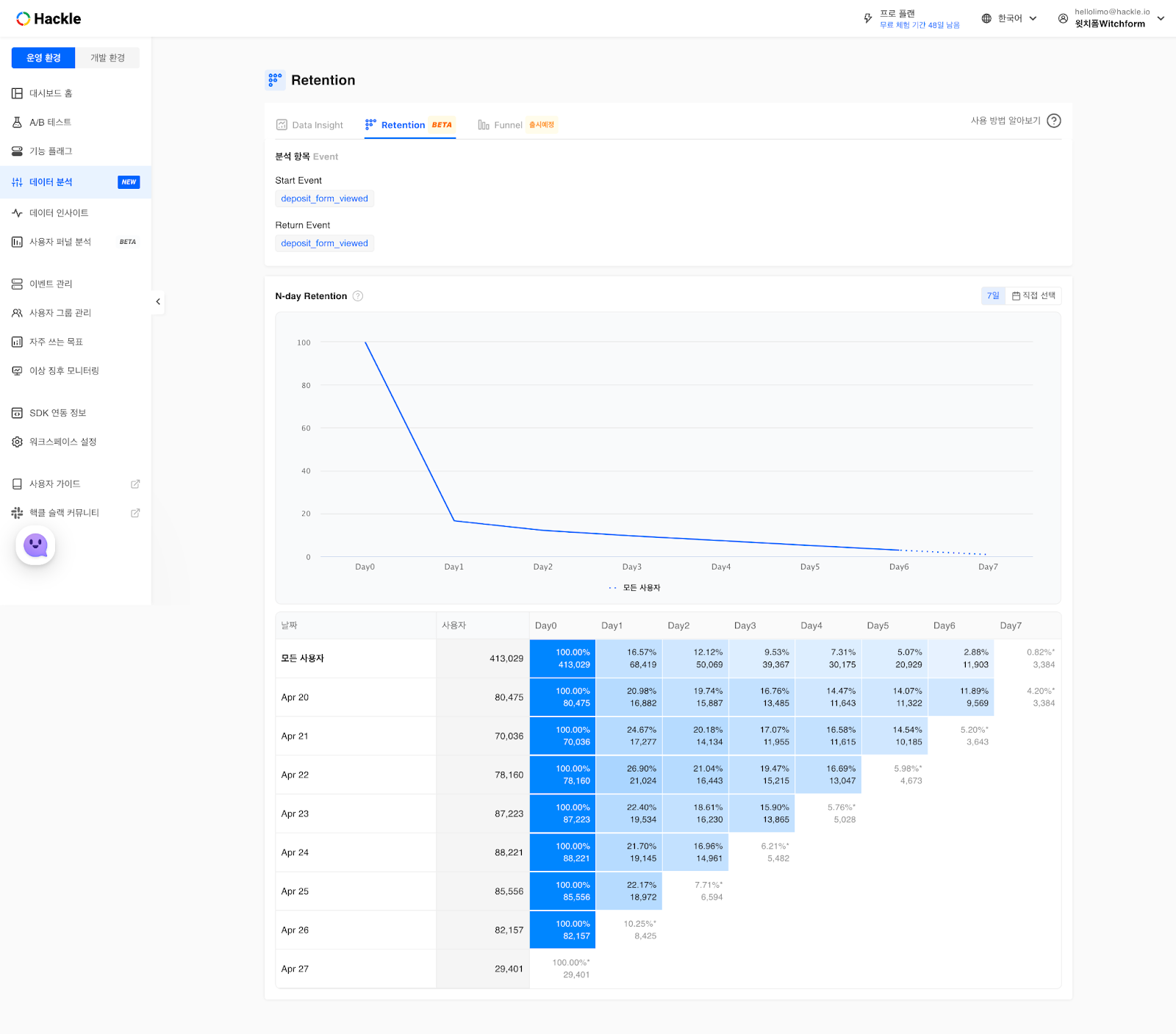 이벤트 기반 리텐션을 정의하고, 코호트/퍼널 별로도 쉽고 빠르게 비교할 수 있습니다.