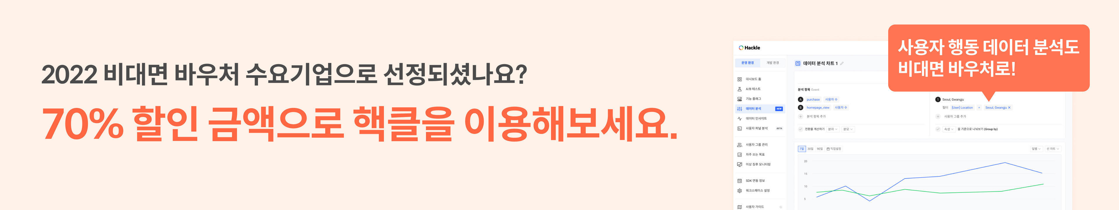 2022 비대면 바우처로 데이터 분석, A/B 테스트, 기능 플래그, 사용자 퍼널분석까지 핵클의 모든 서비스를 이용해보세요. 사용량은 이벤트 기준이며, 예상 금액은 다음 페이지를 통해 확인해보실 수 있습니다. [👉🏻핵클 가격플랜 확인하기]