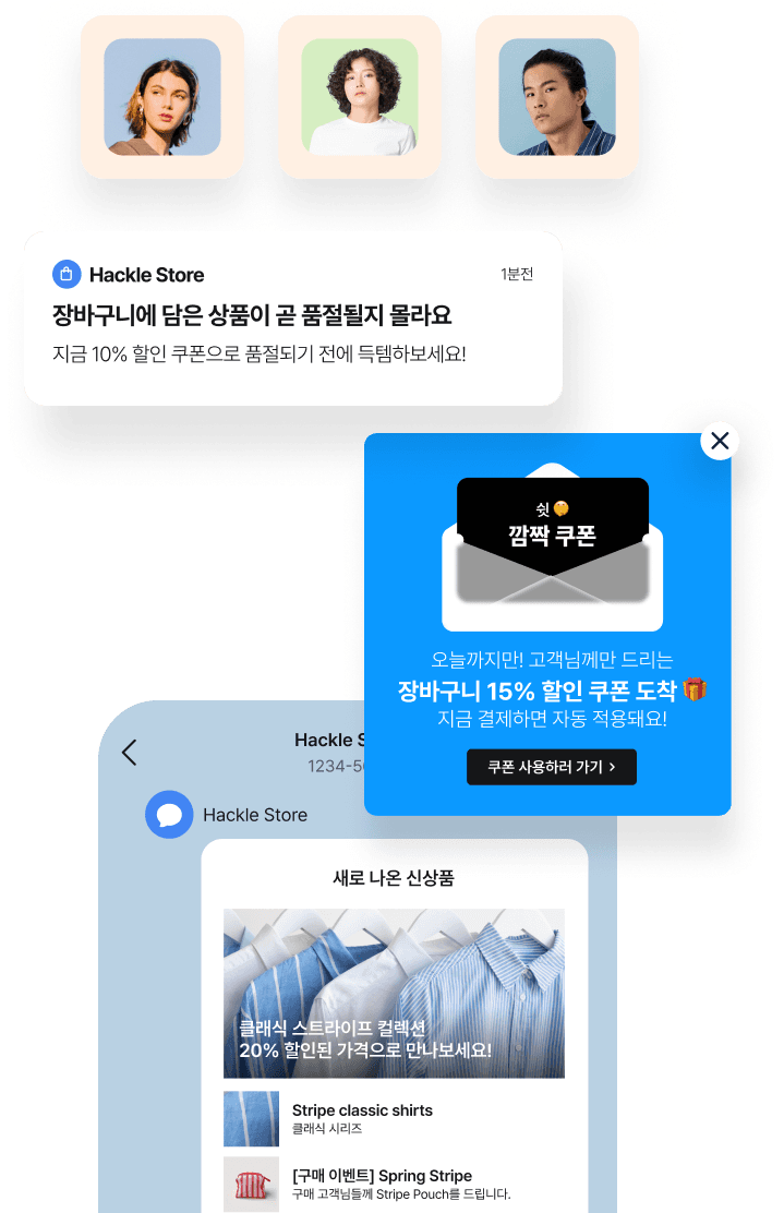 핵클에서는 다양한 메시지 채널을 고객 여정에 따라 자연스럽게 연결할 수 있습니다.