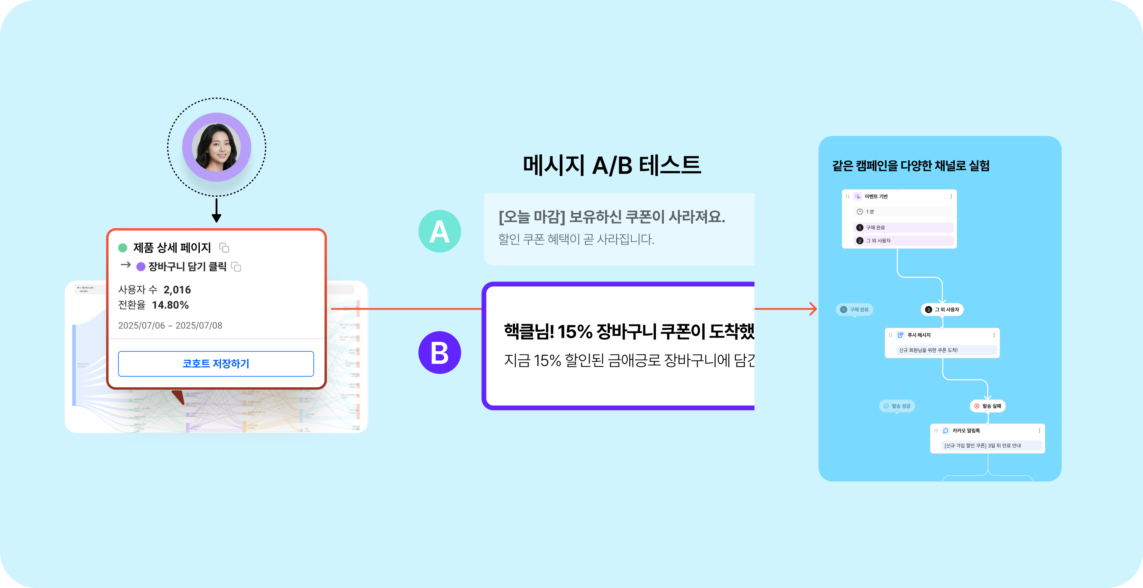 핵클은 이런 고객 행동 데이터를 기준으로 앱, 웹 구분하지 않고 프로덕트, 상세 페이지, 메시지 등을 A/B 테스트로 비교해 고객 반응을 확인하고 구매·재구매·이탈 데이터를 기반으로 고객 여정에 맞는 메시지를 자동으로 실행하고 그 결과를 운영 전략에 반영하는 전 여정을 하나의 흐름으로 연결해 자동화 하는 구조를 만드는데 집중하고 있어요.