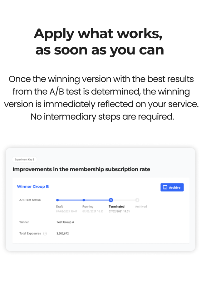 Maximize performance and enhance user experience by conducting MAB tests in display areas such as home screen banners, product carousels, and recommendation rankings. Then analyze user responses real-time to identify the most effective variant.